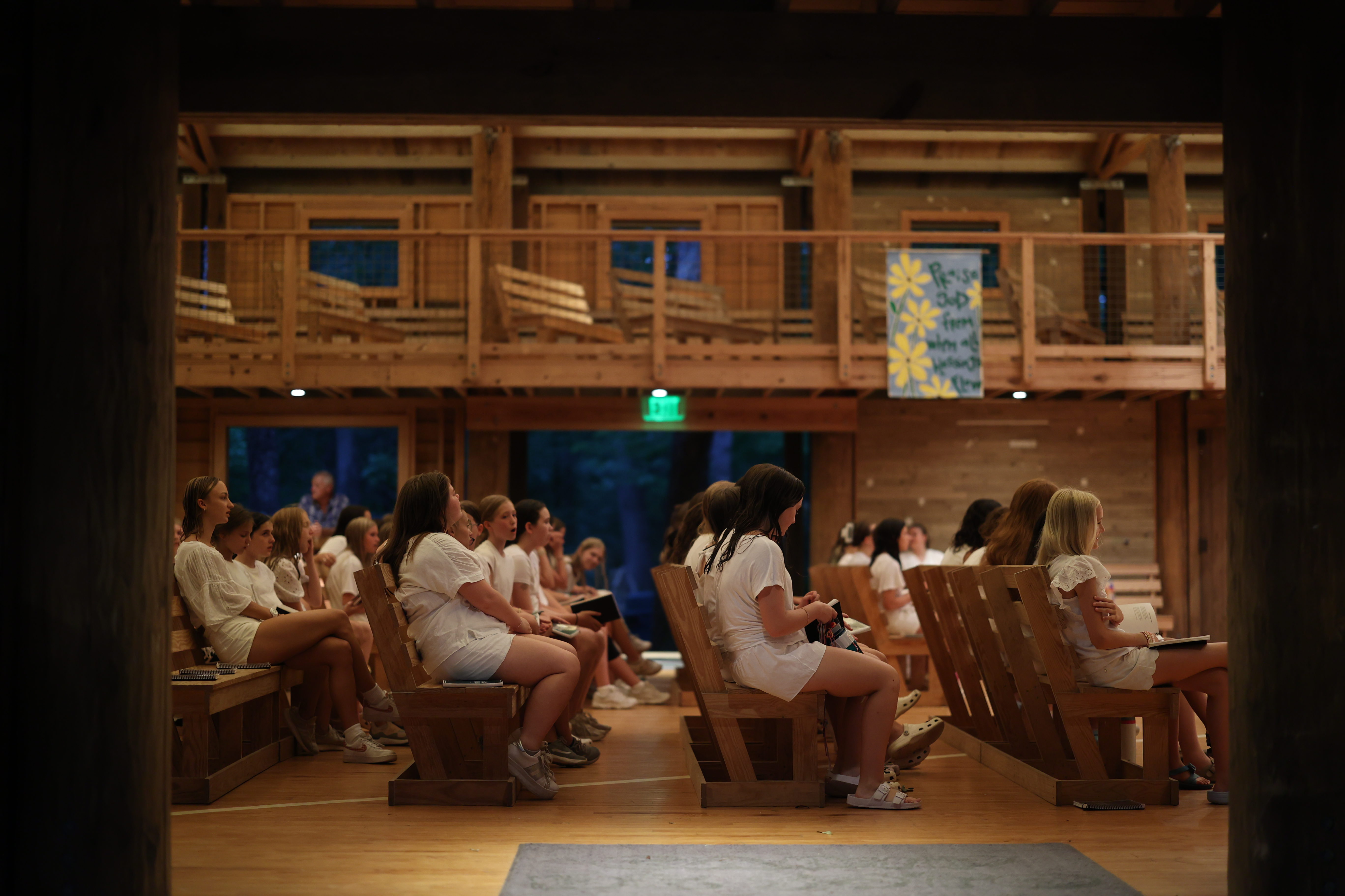 Clean and dressed in white, we gather for worship in the Camp DeSoto gym.
